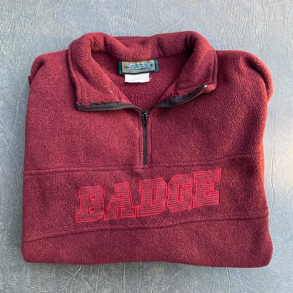 Vintage Soft maroon red fleece quarter zip pullover. 90s style. Embroidered detailing. Item is lightly worn, but quality is in near-perfect condition. No marks. No pilling.