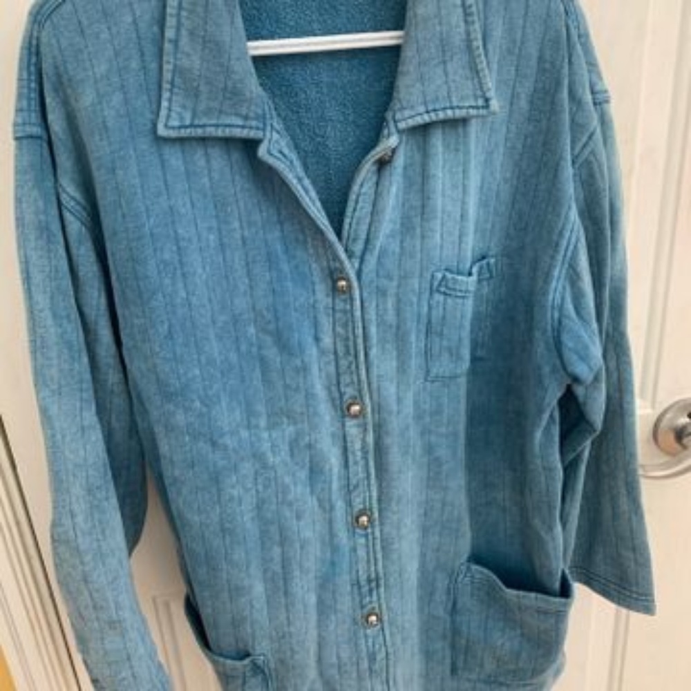 The look and shade of denim in a cozy thick quality stitched fleece. Nice pocket and front button details.