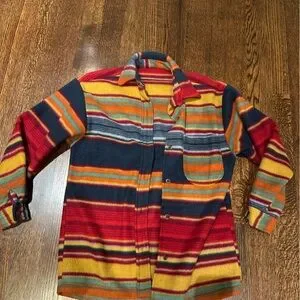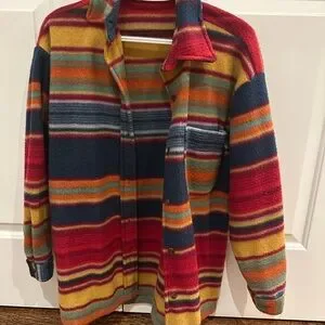 Vibrant striped jacket with button-up front. Features a mix of bold colors. Perfect for adding a pop of color to any outfit. In excellent condition, no noticeable flaws.