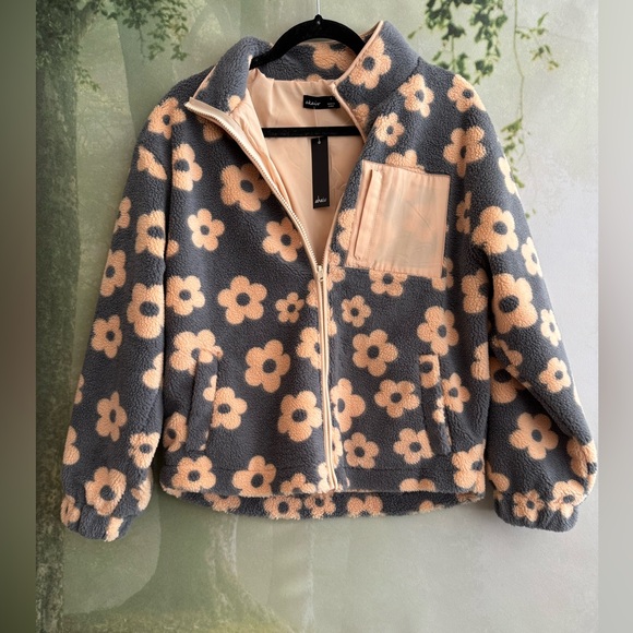 Dark grey fleece with pastel orange daisys