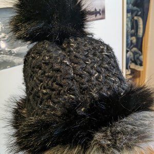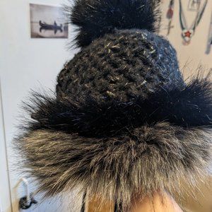 Fleece lined knit hat, faux fur, with fuzzy pom-poms