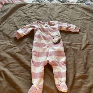 Three fleece pajamas size 6 months. Dark green and striped pajamas are two way zipper closure, light green is button closure. Very good condition no stains/tears to fabric. Price is for all three