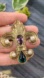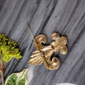 This exquisite gold brooch features a classic fleur-de-lis design, adorned with striking purple and green accents. Perfect for adding a touch of elegance to any outfit.