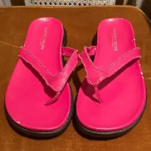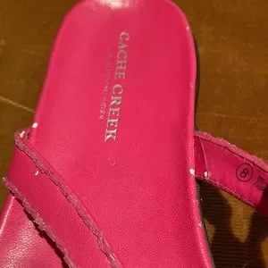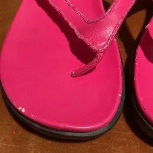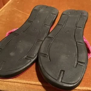 Really cute flip flops. Giving Y2K vibes. I don’t think they’ve been worn much but the faux leather is starting to flake off in certain areas just overtime. I try to include as many photos as possible.