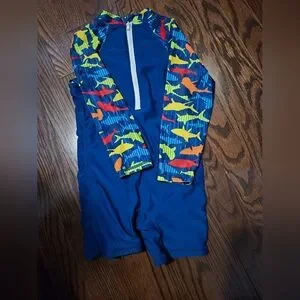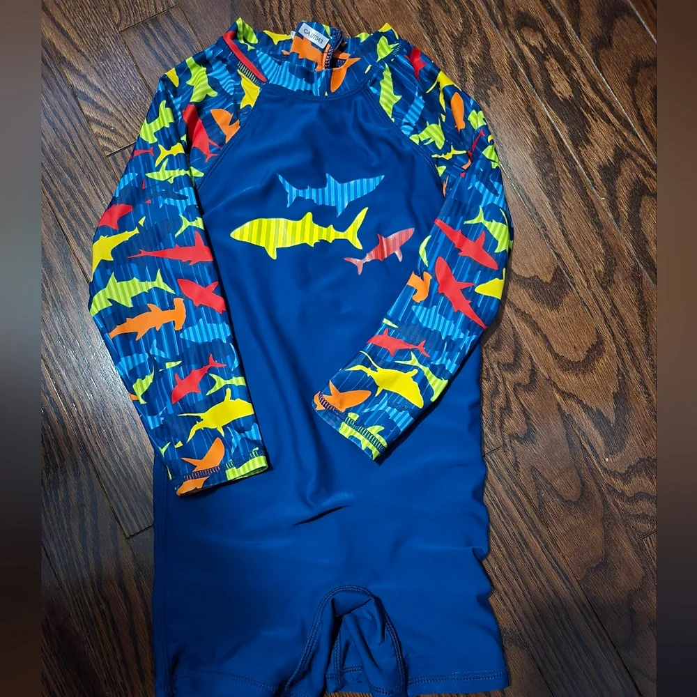 it was worn once. in excellent condition. Bright and playful rashguard with vibrant shark pattern. Ideal for beach adventures.