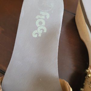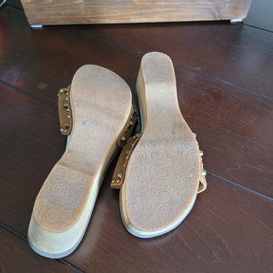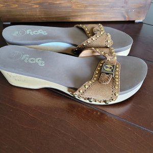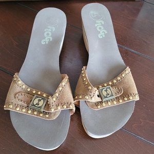 Very heavy and sturdy wedges. Wooden soles with a memory foam cushion and a leather upper portion. Size 10 women's
