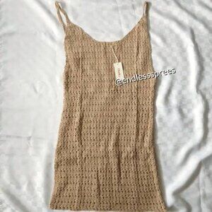 Brand new Flook the Label Rumer Mini Dress. Intricate crochet woven cover up dress in honey (beige or cream). Scoop neckline, mesh, adjustable spaghetti thin straps. All garments are hand-made using eco-responsible and fair labour practices, with locally-sourced, sustainable materials and plant-based dyes. 100% cotton.