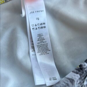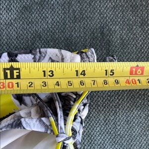 Stylish bikini bottom with grey floral print and yellow splashes. Features side ties for adjustable fit. Perfect for beach days.