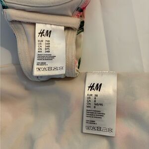 Stylish bikini set with vibrant floral design. Features pink, green, and cream colors. Strapless bikini top.