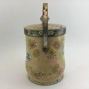 Some wear to the paint, especially where the lid meets the rest of the tin. A few scratches, scrapes, and dings here and there from years of enjoyment, as pictured. Handle and knob have wear to their gold paint. A few spots of oxidization inside, as shown. There is sticker residue on the bottom. Please see photos.