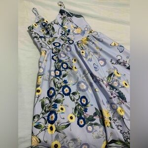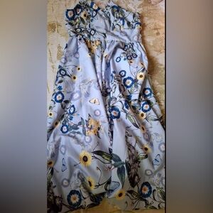 A romantic bohemian-inspired midi dress crafted from a lightweight woven fabric with a subtle sheen. Featuring a delicate spaghetti strap neckline, a flattering high waistline, and a gracefully flared hem. The pleated skirt flows effortlessly with movement, while the daring backless detail and hidden zipper closure add an alluring touch. Perfect for spring festivals, summer evenings, or seaside getaways, this lined blue floral cami dress balances comfort with timeless elegance.