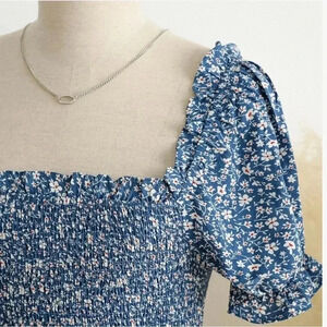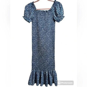 Stunning Floral Midi Bodycon Dress, Small, Short Puff Sleeves, Square Neckline, Ruffle Hem Mermaid. Entire body of dress is smocked, lots of stretch!