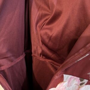 Elegant burgundy dress with a floral pattern. Long in length with flutter sleeves. Light padding in chest area.