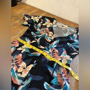 Robe estivale à manches courtes de la marque Roxy, avec imprimé tropical sur fond noir. Décolleté en V, boutons décoratifs à l’avant et jupe légèrement évasée. Tissu léger et fluide, parfait pour l’été.