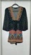 Elegant women's sheer top featuring a vibrant floral design, colorful, dark base with green, orange and yellow designs, deep V-neck and flowing sheer sleeves, nice bowtie in the back, purchased in UK.