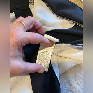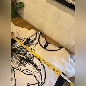 Elegant ivory blouse with bold black floral print and contrast trim. Lightweight and slightly textured fabric. Three-quarter sleeves, black accents at the cuffs and hem, and a keyhole opening at the back. A chic, artistic piece perfect for work or special occasions.