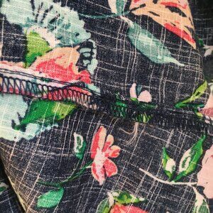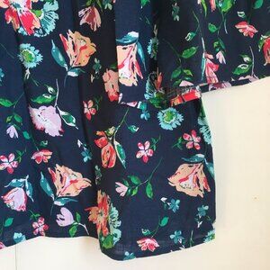 Very good preowned condition, no stretch, cotton top with bell statement sleeves in dark navy blue featuring a gorgeous floral pattern in verdant greens, pinks and red. So pretty. Wish I knew what brand it was as all the tags have been cut out. Nice quality.