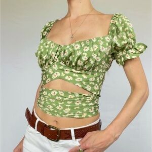 Daisy printed Crop Top. Sweetheart neckline. Short puff sleeves. Crossover hem in the front. Tied to tie at the back and be worn many creative ways. Elastic band on sleeves, back and chest. Flattering fit. Amazing condition, no flaws.