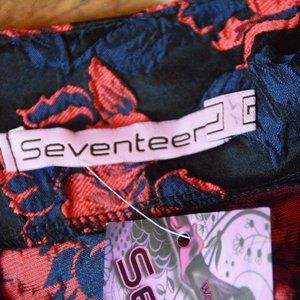 New with tags. Beautiful fitted blue and red floral dress with full-length zipper down the back. Large, but fits small. Armpit to armpit: 18" Length: 34"