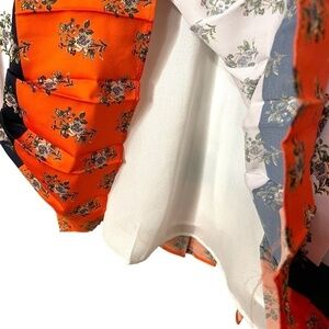 Make a statement in this dress! floral pattern with pops of orange at the boarders. Peekaboo back, elastic waist and pleated and lined skirt.