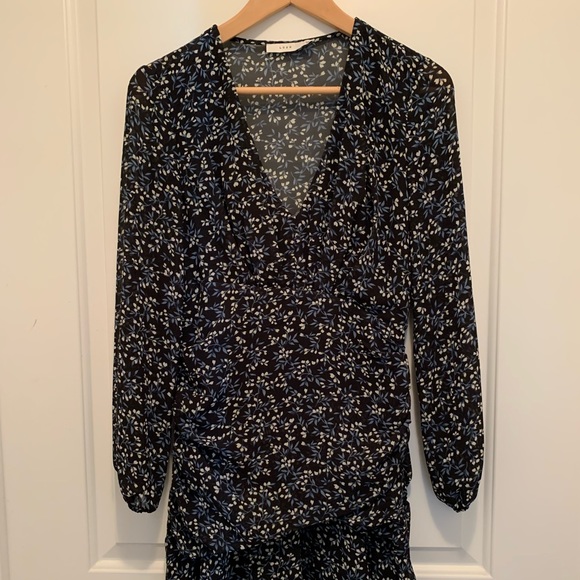 Dark blue mini dress with ruffles. There is a slip for the bottom half and front of the dress. It has been worn twice. I’n great condition.