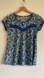 Purple and blue floral pattern. Blue contrasting V with floral embellishment. Retro look from the 70s. The pattern is like the best grandma’s couch pattern! Cap sleeves. Scoop neck. Tailored fit. 65% cotton; 35% polyester. Great used condition.