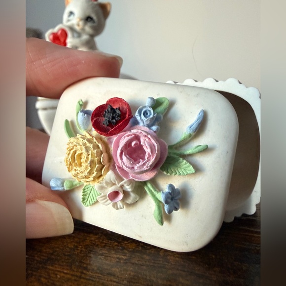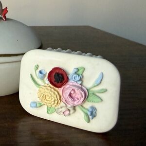 Charming trinket box with embossed floral design. Features red, pink, yellow, and blue flowers.