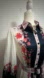 Elegant floral embroidered dress with a belted waist. Features a striking combination of white and black with red floral accents. Perfect for any occasion.