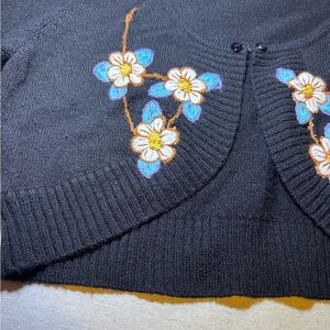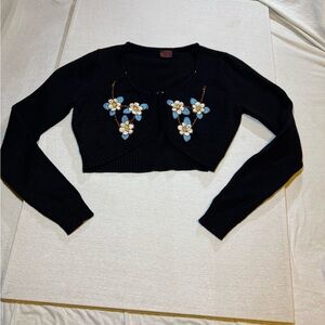 Chic black cropped cardigan with elegant floral embroidery. Perfect for adding a touch of style to any outfit.