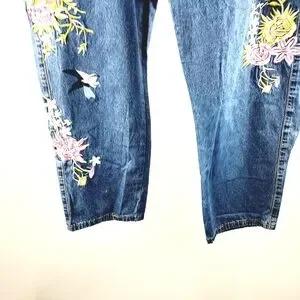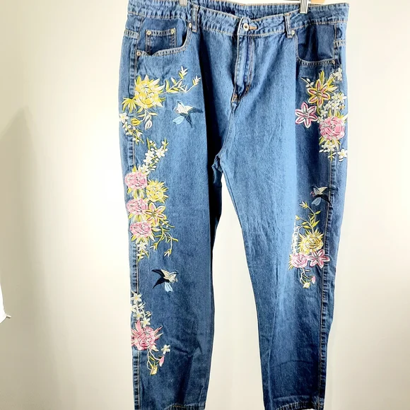 Elevate your style with these high rise jeans featuring beautiful floral embroidery.