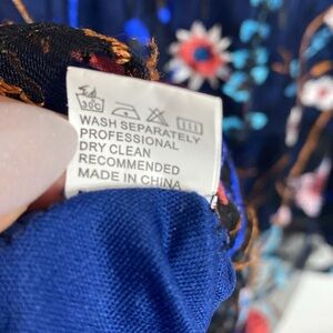 This beautiful dress is even more beautiful in person. Elegant floral embroidered dress with sheer sleeves. Features a stunning mix of colors on a dark base, perfect for any occasion.