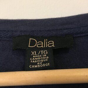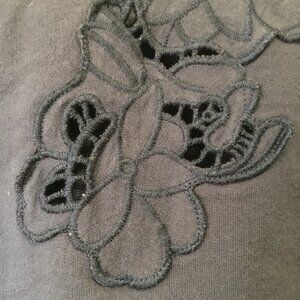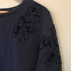 Very good preowned condition, dark navy dusty blue 100% cotton sweater featuring embroidered/mesh integrated floral patterns on the shoulder and sleeve. Beautifully integrated. I am having trouble parting from this because it is so beautifully made and unique, but it is not my size. Front is the exact same in the back with exception to a higher neck. Super duper cute.