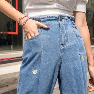 High waisted mom jeans with slight pleat detail, embroidered with flowers.
