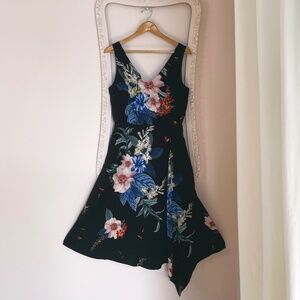The rich navy base highlights a bold botanical print in romantic blush and vibrant blue hues. With a flattering fit-and-flare cut and a flowing asymmetrical hem, this dress, with pocket, strikes the perfect balance of elegance and movement. The zip back and tie belt cinch the waist beautifully, while the luxurious silky fabric adds a soft, refined touch. Ideal for garden parties, weddings, or simply elevating a sunny day.