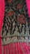 Elegant gray scarf with red floral design. Features fringe detailing.