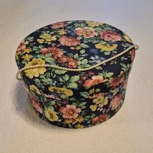 Round floral hat box with a rope handle. Features a vibrant floral pattern on a dark background.