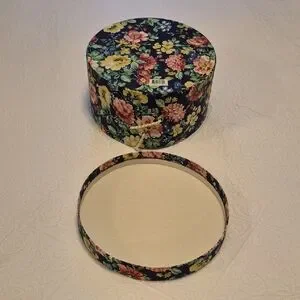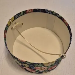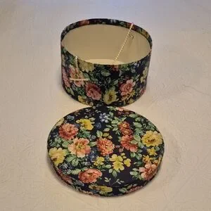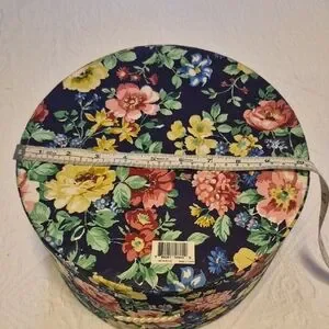 Floral hat box • 10 inch box • Round storage box • Rope handle • Decorative storage • Gift box • Keepsake box • Vintage style • Shabby chic • Cottagecore • Floral print • Home decor • Closet organizer • Bedroom decor • Wedding decor • Baby shower decor • Bridal shower • Vanity storage • Boutique style • Decorative organizer