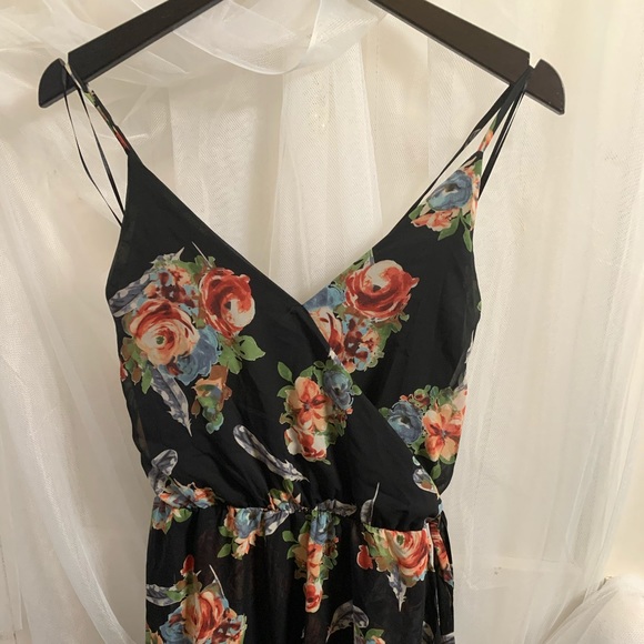 Chiffon fabric, lined and light weight for summer. Spaghetti straps that cross. Both back and front fabric cross over each other. Has a tie on the side under the bust.