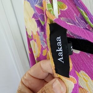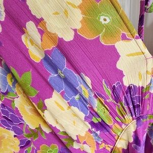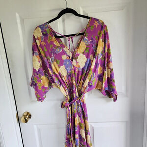 Vibrant floral kimono mini dress with a tie waist and tie back. Features a mix of purple, blue, yellow, and green colors. Fabric is a nice crinkly Gauze Rayon.