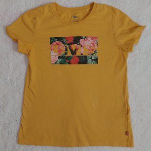 Golden yellow Levi's tee-shirt with a unique floral logo design on the front. This shirt is perfect for summer and has only been worn a few times.