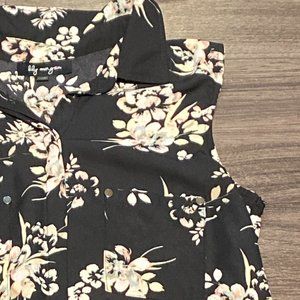 Floral Lily Morgan Blouse, Size Small. Black Blouse with White, Pink, Blue, and Yellow flowers. 100% Polyester.