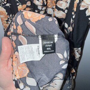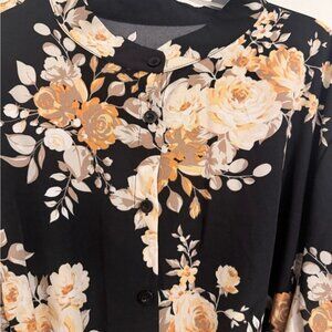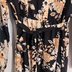 Chic long sleeve dress with floral design. Black and cream colors. Features tie around waist. Very flowy and pretty! Perfect for elegant occasions. Fits more like a 2/3x.