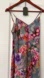 Elegant floral maxi dress with spaghetti straps. Features vibrant floral patterns on a gray background.