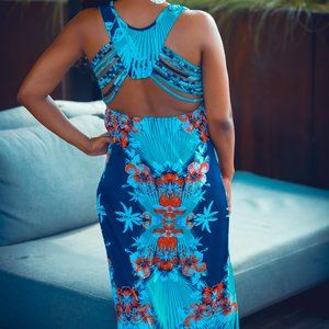 This is a turquoise, navy, and red floral maxi dress w/ a cute detail back design.