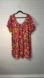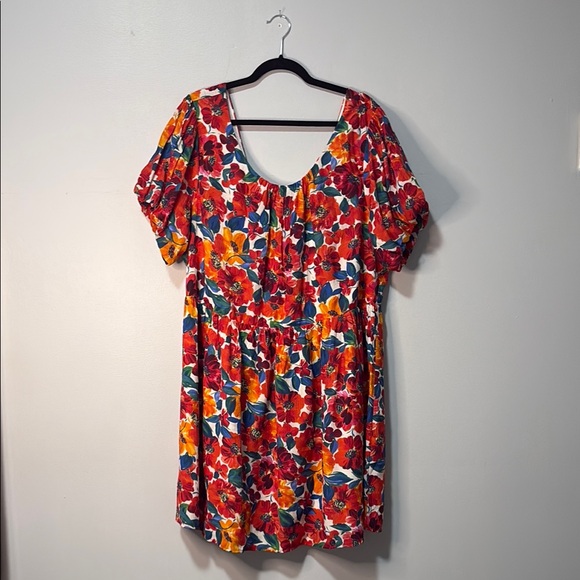 Vibrant floral dress featuring a mix of red, orange, and blue hues.