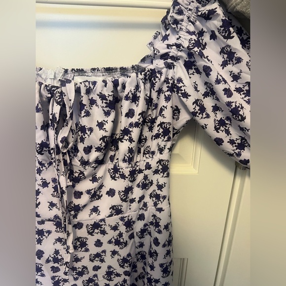 Chic off-shoulder dress with a floral pattern. Features a tie-front detail and long sleeves. Perfect for any occasion.