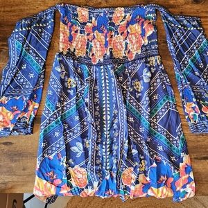 Vibrant off-shoulder dress with floral pattern. Elastic top. Above-knee length. Long sleeves with elastic cuffs.
