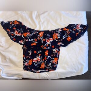 Dark blue off-shoulder top cropped top with a vibrant floral design. Super Soft & Stretchy Pre-loved | Good Condition Size S