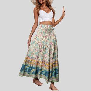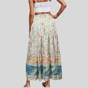 Floral & Paisley Print Shirred Ruffle Hem Maxi Skirt