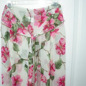Light floral palazzo pants with shiny spots - M - new, never worn - 29-30inch belted waist - 34inch inseam - hand wash - 90% polyester, 10% spandex - made in Mexico